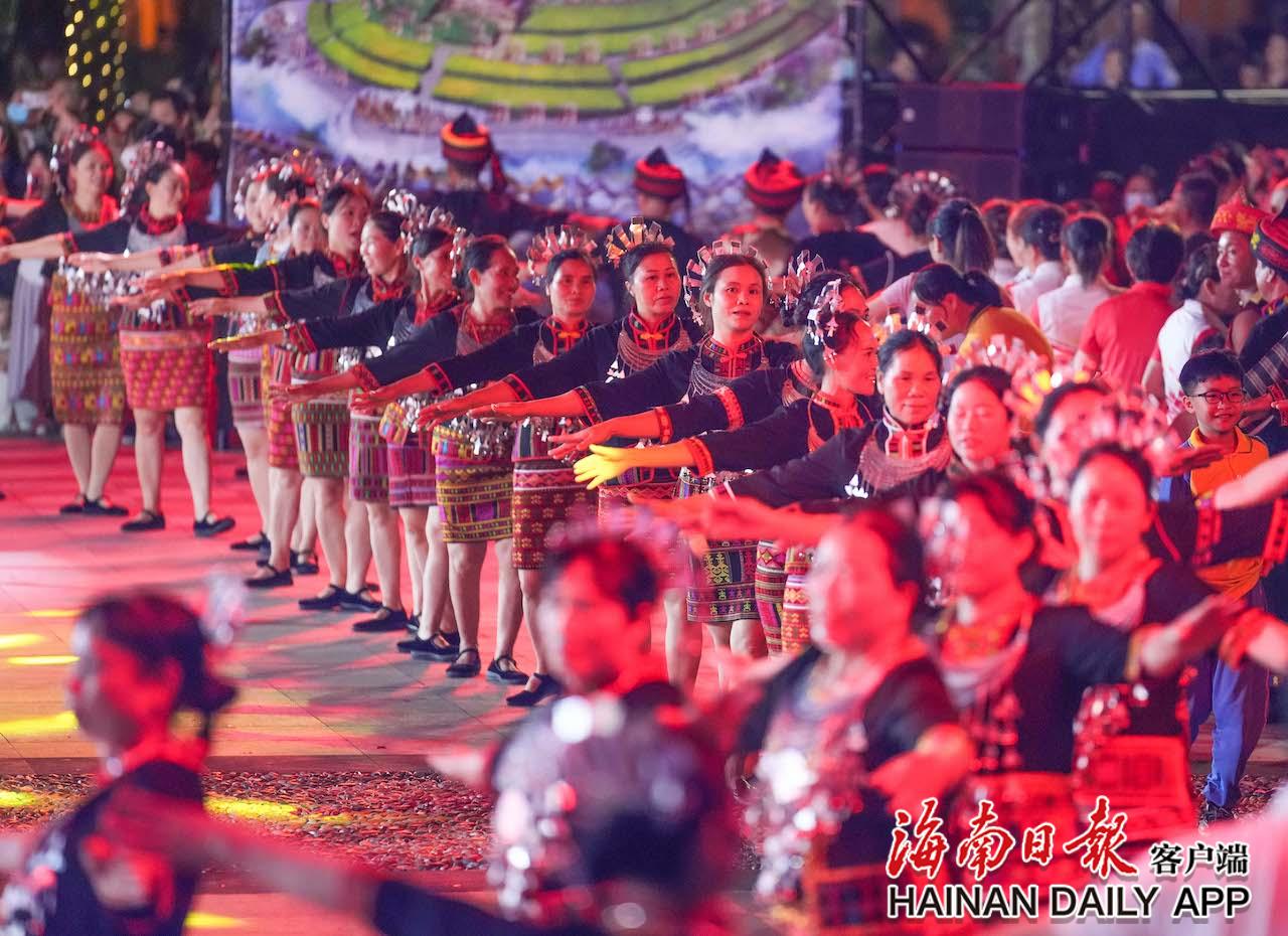 4月17日,在五指山市通什鎮(zhèn)的三月三廣場(chǎng),黎族群眾跳起共同舞。海南日?qǐng)?bào)記者 李天平 攝