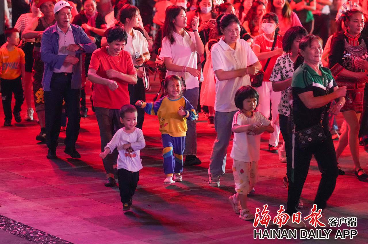 4月17日,在五指山市通什鎮(zhèn)的三月三廣場(chǎng),家長(zhǎng)帶孩子參與到共同舞中。海南日?qǐng)?bào)記者 李天平 攝