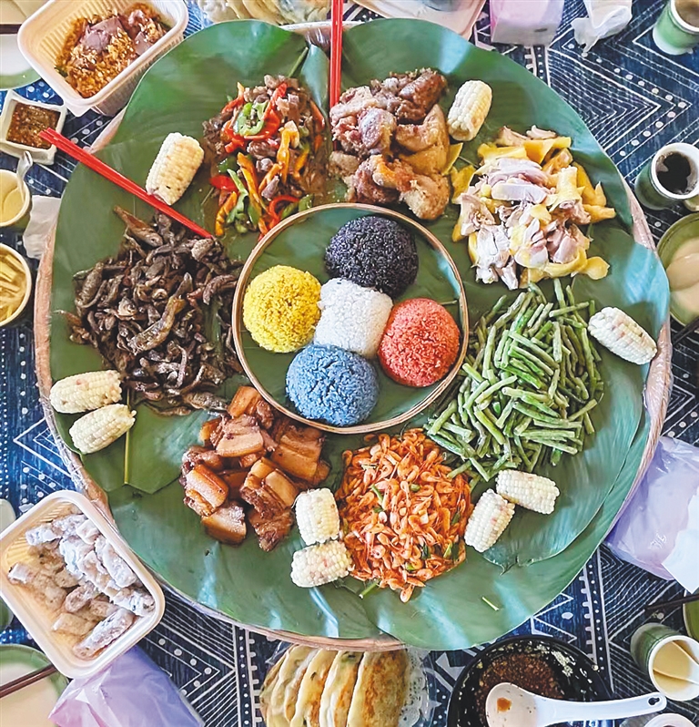 苗家簸箕餐,包含了香煎五腳豬肉、五色飯、苗家船型粽等美食。海南日報記者 謝凱 攝