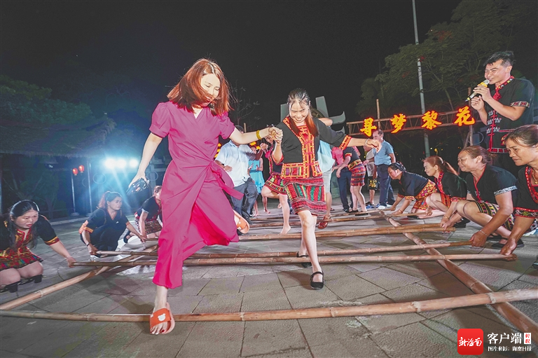 5月1日晚,在昌江黎族自治縣王下鄉(xiāng)浪論村,游客和村民們跳竹竿舞,體驗黎鄉(xiāng)風情。海南日報記者 陳元才 攝