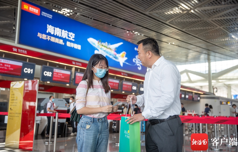 海口美蘭國際機場市場部副總經理李洪志向美蘭機場2023年第1000萬名旅客李昕曉贈送紀念品。記者 劉洋 攝
